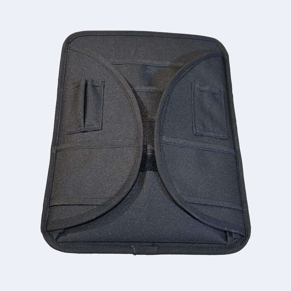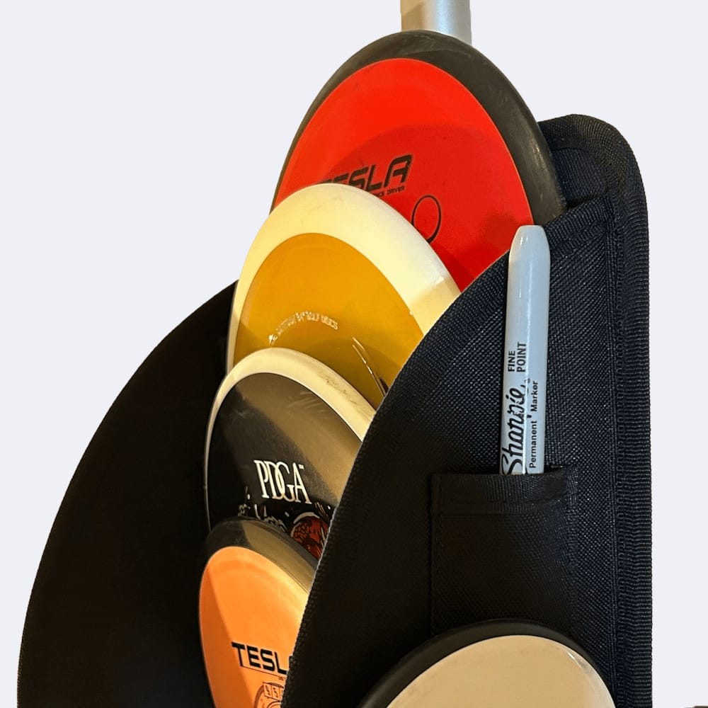 Die seitlichen PVC-Fächer – eines davon transparent – sind ideal für dein Smartphone. Selbst bei Regen kannst du dein Handy bedienen und Scores eingeben. Auf derselben Seite befindet sich eine Halterung für Discgolf-Tools wie z. B. ein Kamerastativ. Rechts findest du einen großen Flaschenhalter sowie eine Velcro-Fläche für deine Patches.
