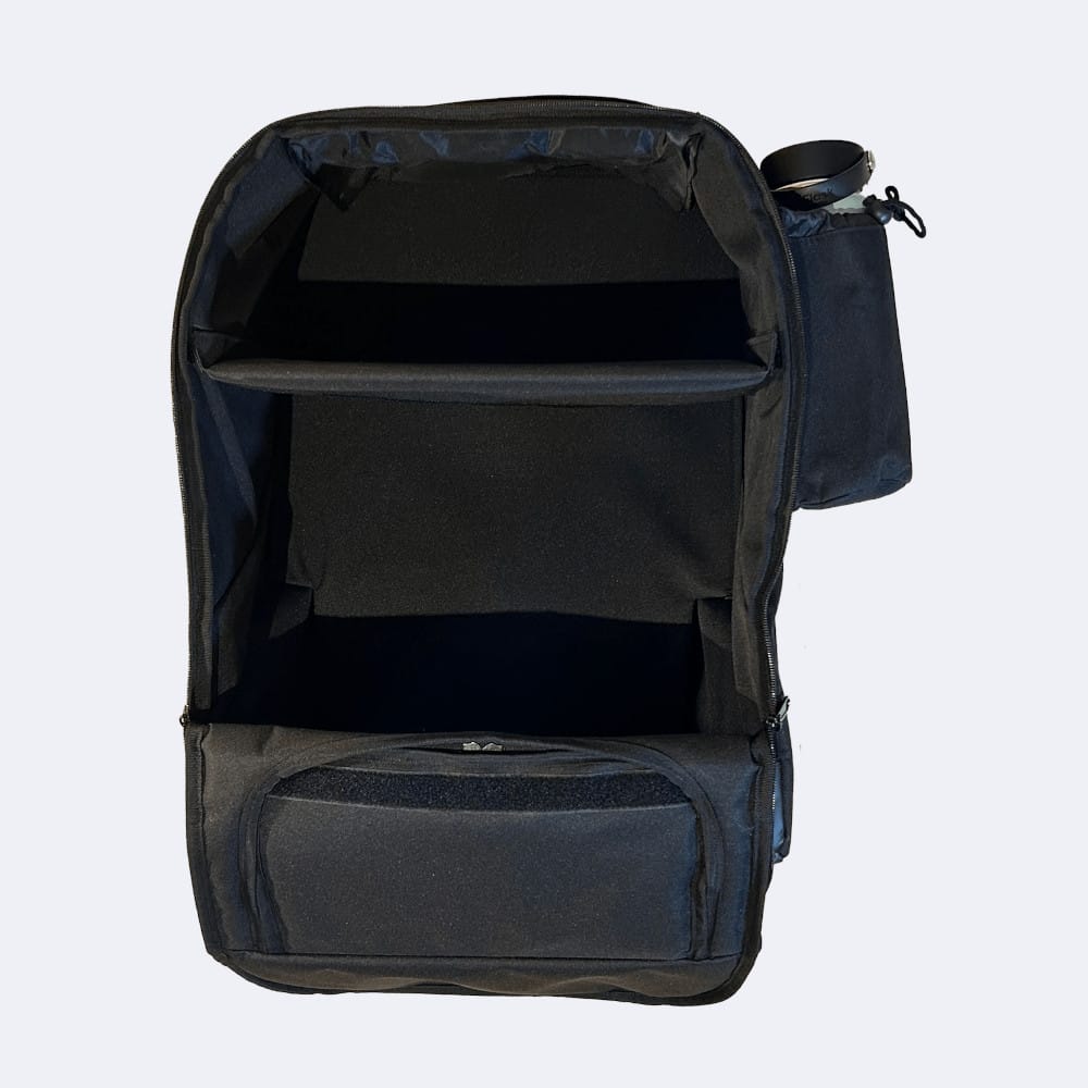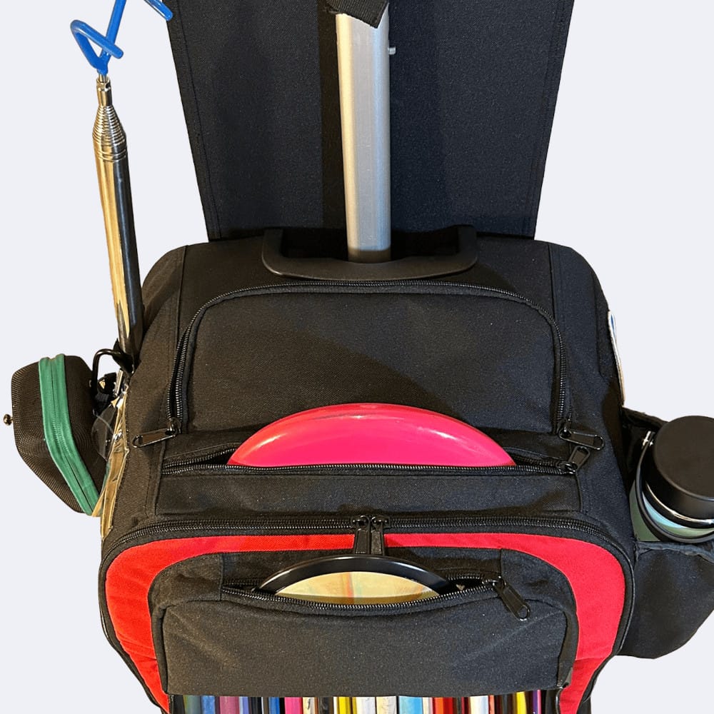 Ein großes Top-Fach bietet Platz für Kamera, Jacke, Getränke oder weiteres Zubehör. Zusätzlich befindet sich im oberen Bereich ein separates Fach für 1–2 Putter. Ein Frontfach eignet sich für kleinere Gegenstände oder eine Macro Disc.